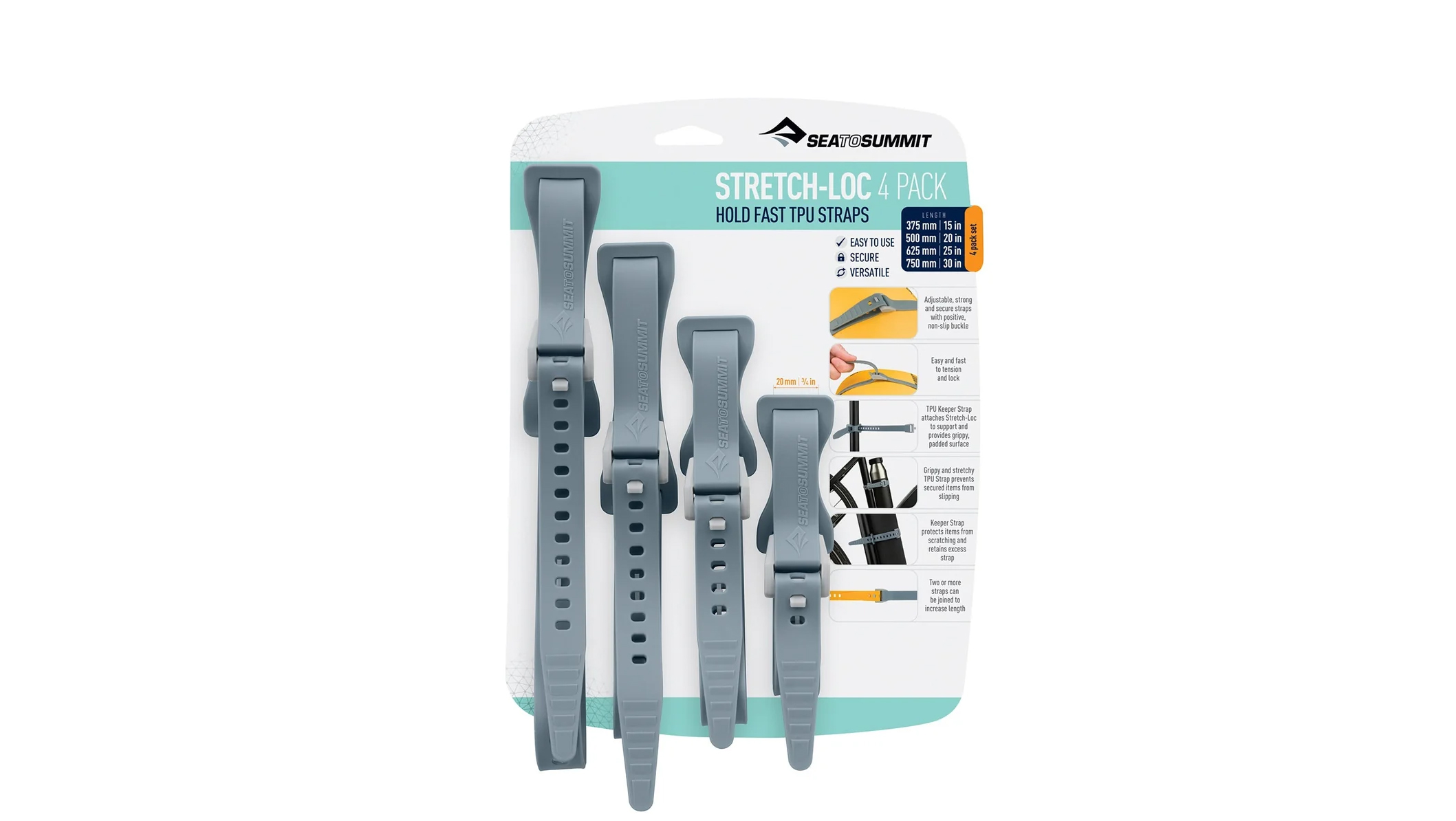 Stretch-Loc straps will become an integral part of adventure preparation. Stretch-Loc straps are made of tough, stretchy TPU with co-molded acetal buckles. Simply wrap the super tough TPU strap around whatever you’re fastening together and lock it in place with the easy-to-use buckle. Any excess strap will lie flat against the loop, conveniently out of the way. The unique slimline Keeper Strap creates extra grip that further strengthens the hold allowing you to lash difficult items together securely. It also provides cushioning between items prone to damage.